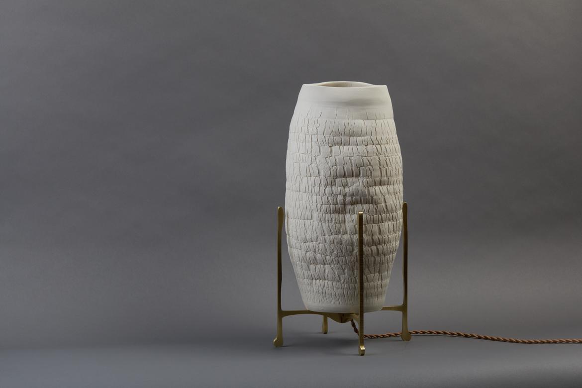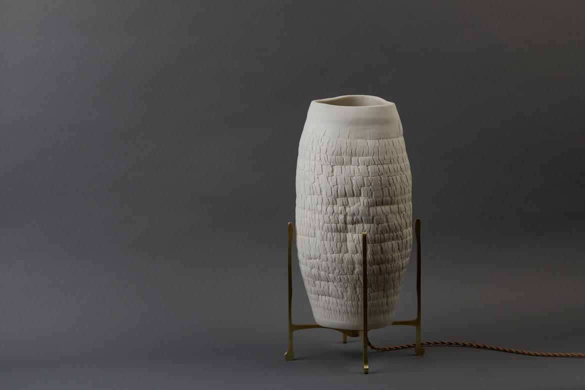Inspired by the beauty of a dried-out desert lake bed, each piece is a handmade one-of-a-kind object that produces a mysterious quality when internally lit, embracing the flaws and accidents inherent in the craft and process of making: the series exemplifies the wabi-sabi ethos of acceptance of transience and imperfection.
