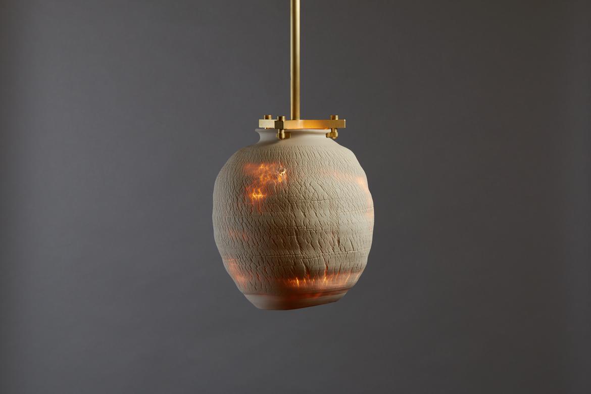 Each piece in the Desert Series is a unique work of art, made of porcelain using a unique fabrication technique developed with Paone’s paternal aunt, the ceramicist Anne Paone. Two new additions in this series, the Desert Table Lamp and Large Desert Pendant in the Negative Finish, offer the same visual and textural elements in an alluring shade of black with blackened brass hardware. The Negative Finish, conceived with new collaborator ceramicist Jeff Nimeh, takes the original series and inverts the aesthetic using metallic oxides and carbonates.
